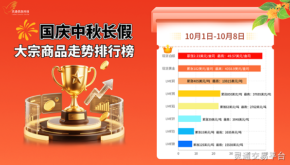 10月1日-10月8日,中国国庆中秋长假,国内市场休市8天,外盘大宗商品迎来狂欢时刻,贵金属表现强劲,有色金属集体上扬。