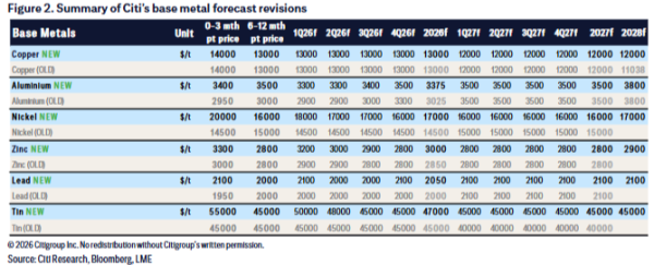 (花旗银行基本金属价格预测调整情况的汇总)