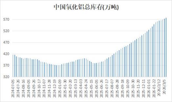 不过,虽然近期减产缓解供应端压力,但当前氧化铝运行产能总体变化不明显,产量阶段性企稳。下游电解铝运行产能小幅增加,对氧化铝需求有所抬升,但氧化铝产量仍显著高于消费量。另外,由于霍尔木兹海峡封锁,影响铝土矿及氧化铝进入中东地区,导致更多海外氧化铝流入国内的可能性上升,国内氧化铝进口量或有增加。国内库存攀升态势不改,据统计显示,截止3月12日,中国氧化铝社会库存为577万吨,较上周增加4.8万吨。