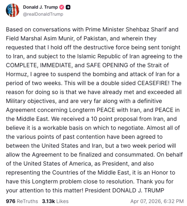 在距离最后期限不到90分钟时,特朗普让步了。他在一条社交媒体帖子中写道,他已同意与伊朗停火两周,并将暂停他所威胁的打击行动,前提是伊朗立即重新开放霍尔木兹海峡。