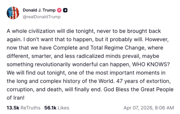 美东时间周二早上8点06分,特朗普发出了其总统任内最戏剧性的最后通牒:除非伊朗在未来12小时内达成协议,否则“一个完整的文明将在今晚消亡,再也无法恢复”。
